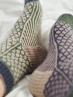 The Mergelland Socks are a fun pair of socks, created to play around with colour. You can go playful and bold or more subtle and neutral. You can choose to work with 4, 3 or even just 2 colours to make them fit your own style and preference. They are great as a first colourwork sock project, as the pattern is easy to remember and there aren’t any long floats to catch. The socks are worked from the cuff to the toe so you can be sure they’ll fit around the heel.