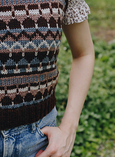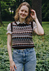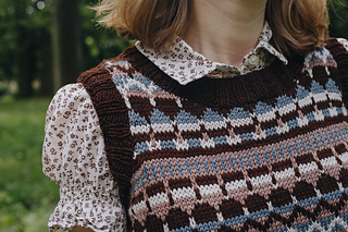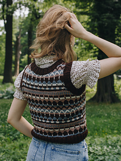 Miaz is a vest worked from the bottom up. Double ribbing is worked at the hem, then the body is worked up to the underarms in the round. At the underarms, the work is divided into front and back, and the top of the vest is then worked in st st back and forth. Bind off stitches are used to shape the underarms and neckline, and the stitches at the shoulders are joined with 3 needle bind off. Finally, stitches are picked up around the arms and neckline, and double ribbing is worked to finish the vest. The motif for Miaz was inspired by embroidery from the Kurpie region of Poland, and although the embroidery was traditionally in red or black thread, I chose to interpret their patterns into a 4 colour design.