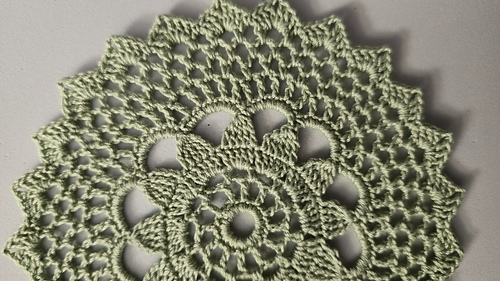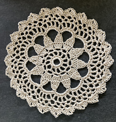This is a pattern for a small, round crochet doily made with cotton thread size ten (such as Aunt Lydia’s) and a steel hook 1.6 mm.