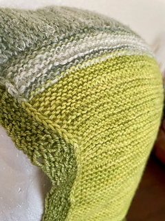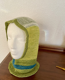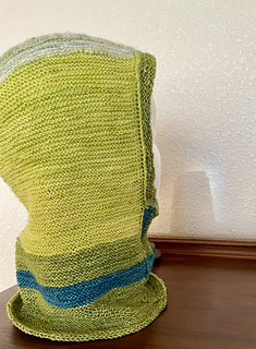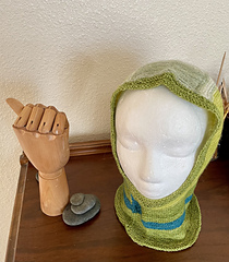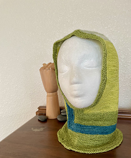 This is an easy project with interesting shaping! It’s knit in light yarn at a warm, dense gauge, has nice finishing details including a border knit around the face opening and exposed seams and faux-seams, and looks great in scrap yarns—scraps or striping yarns will show off the unique construction better than a solid color.