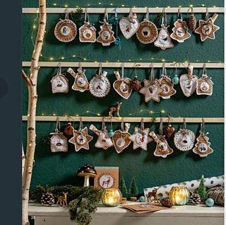 Star, heart, bell, house and wreath in tan and white. Also shown as advent calendar.