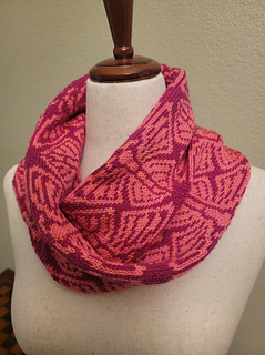 The Monarca Cowl features a repeating butterfly colorwork pattern inspired by the geometry found in Art Deco designs. The colorwork is visible on all sides, so the stranded yarns are hidden. The cowl size is pictured. The larger size creates a double wrap for an infinity scarf style.