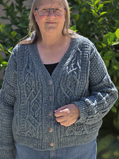 The cardigan is knit from the top down, starting with the back shoulders. The shoulders are shaped with short rows. The Right and Left Fronts are picked up along the cast on edge of the Back shoulders, then knit downward with should row shoulders and V-neck shaping worked at the same time, all shown on the charts. The Fronts and Back are then joined in one piece and worked downward to the hem. Sleeves are picked up at each armhole and worked down to the cuff, in the round.