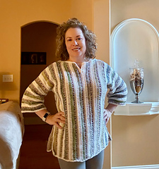 Solid neutral shades of Sonata in Vanilla and Pebble play off the variegations of Akari color 17, that evokes tones of sand, sea and shore. Flattering vertical stitch textures, a deep V, and crab stitch (reverse sc) finishing combine to make this stylish tunic that everyone will love to wear.