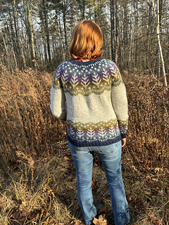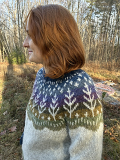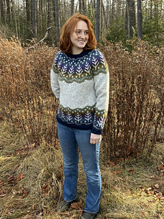 Construction method: The body of this pullover is worked seamlessly in the round from the hem up to underarms. Sleeves are worked in the round from cuff to underarms. Body and sleeves are then joined and yoke is worked in the round to neck ribbing.