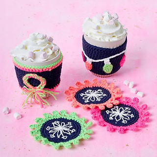 The pattern is written for a cup with sloped sides. Cosies measure approx 22cm (8¾in) in circumference. Instructions are included to adjust for any mug size and also straight edges.