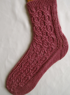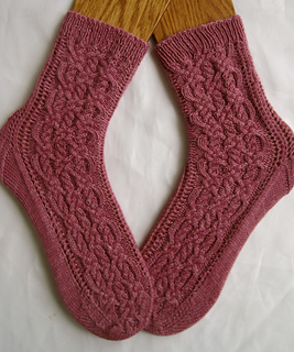 This pattern is for a pair of ornate cable socks. The cable is quite complex and requires good knitting skills. There’s a small amount of lace in the socks for ease of wearing. There’s enough “give” to make them comfortable: they will hug your ankle/leg without being too tight. There is an unusual cabling to make them interesting to look at and fun to knit. The back and front are the same until the heel flap.
