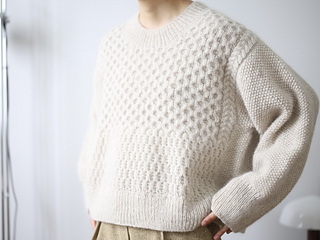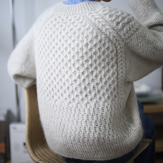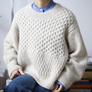 The Nid Sweater is a sweater version of the Nid Dickey Vest. Its straight armhole design creates a clean, modern silhouette while the changing patterns of the sweater brings a sense of lightness. This warm, soft sweater is knitted using a combination of fingering weight yarn and lace weight mohair yarn. The back yoke is knit first with increases from the shoulders down. The front stitches are picked up separately along the shoulders, then joined after the front neck slope shaping. The back and front are joined at the underarms to be knit in the round to the hem. Stitches are then picked up around the armhole for the sleeve and knit in the round. To finish, stitches are picked up around the neck opening and the collar is worked in rib. The length of the body and collar can be changed to your preference.