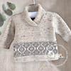This modern sweater has a traditional Fair Isle twist and is knitted in pieces…..front, back, and sleeves. The shawl collar is knitted separately and then sewn into position, seaming required.