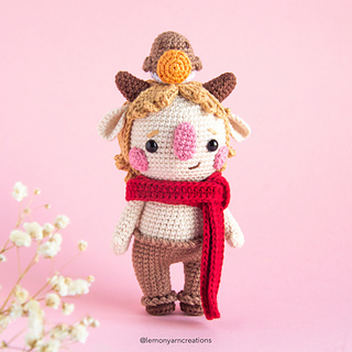 The pattern is written in U.S. terminology. The main part of this project is worked in rounds so you might want to use a stitch marker to mark the end of each round. There is no specific gauge for this project, just try to keep it tight and even throughout each piece. Oak the Faun measures approx. 15.5cm (6.1in), when using the same yarn/tools as indicated below and working with the “x” single crochet technique (yarn under, yarn over).