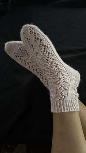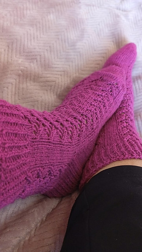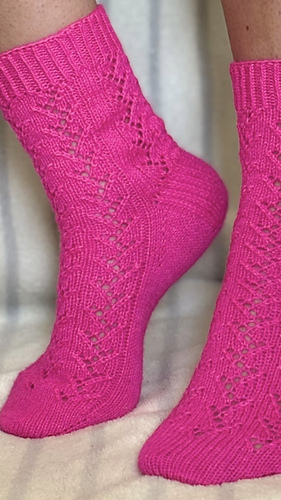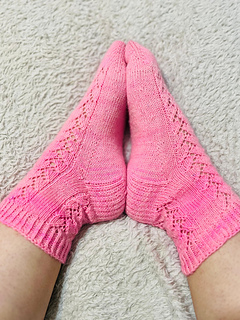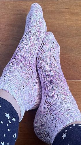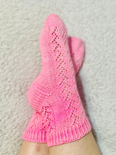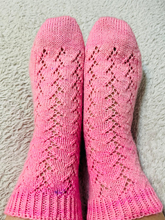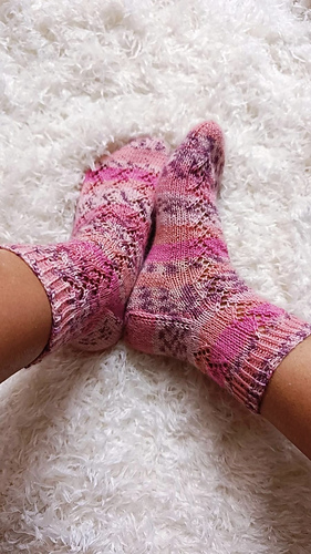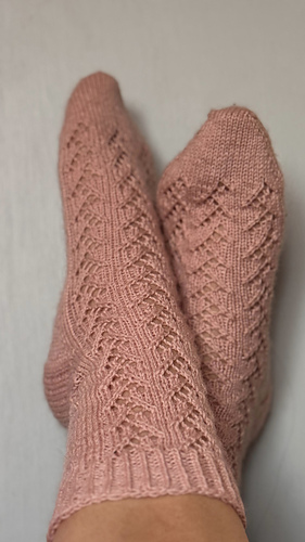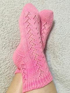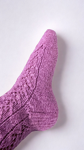 The socks are knitted from the toe up. They’re knitted in stockinette with a lace motif and a rounded heel.