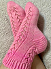 Estos calcetines se tejen desde la puntera hacia la caña. Están tejidos en jersey con un diseño frontal de puntos calados y con un talón redondeado.