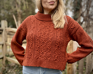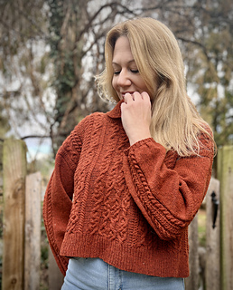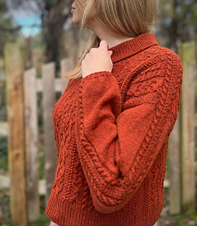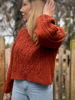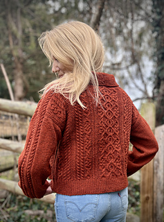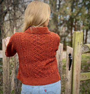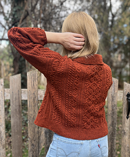 CONSTRUCTION: A drop saddle shoulder worked from the top down. Saddles are knit first, with the back then picked up and worked to the armholes. Fronts are picked up separately, with the neckline shaped before joining. Back and front are joined at the underarms and worked in the round to the hem. Sleeves and collar are picked up and worked in the round to finish; sleeves are gently tapered with a final decrease worked before the cuff for a slight puff.