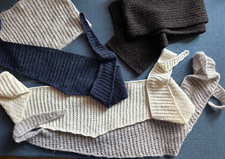 The necktie and cowl can be made with as little as 25g of lace weight floof, or 50g of 4ply. The scarf can be made with as little as 50g of lace weight floof, or 100g of 4ply.