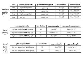 Each neckwear item has its own pattern page where you will find guidance on how much yarn is required for lace weight and 4ply, depending on the finished measurements you would prefer.