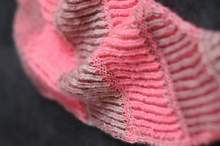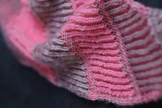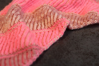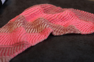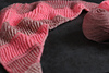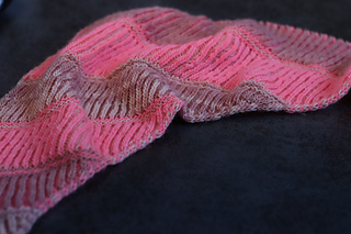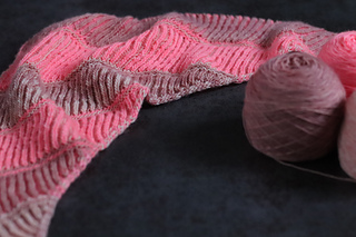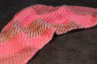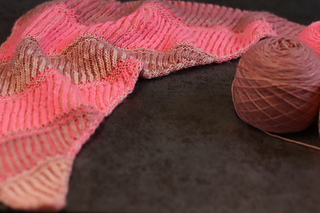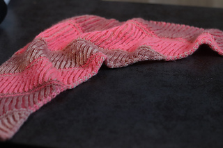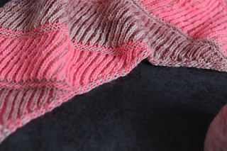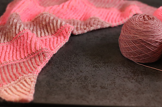 Orbeille is a brioche shawl where textures and colors engage in a rhythmic, structured interplay. Vertical brioche lines stretch like subtle echoes, while horizontal garter stitch bands punctuate each section, adding lightness and dimension.
