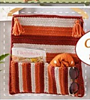 Hanging organizer in white, orange, and red; has pockets to hold items.