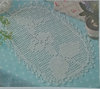 Oval filet doily in white depicts a flower with a hummingbird; lace edging