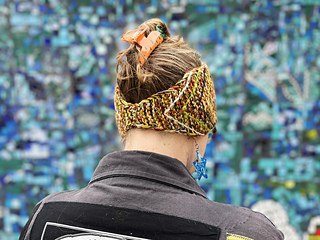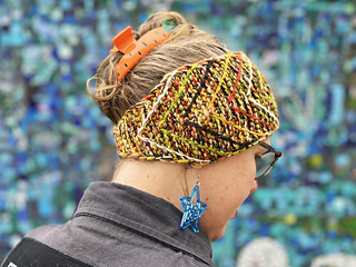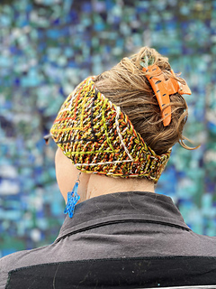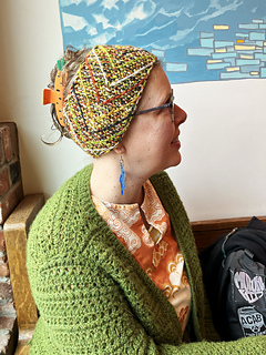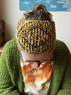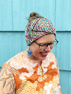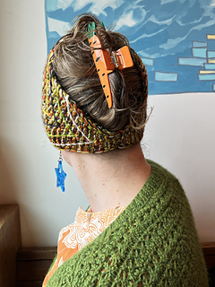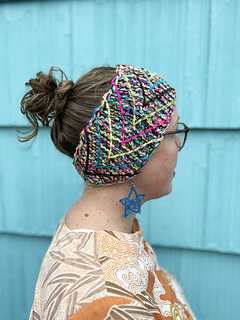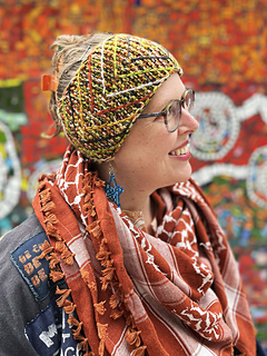 It’s a bit weird but it works and makes for a cool effect! The headband is constructed flat from one narrow end to the other, then seamed together when it’s done. It’s designed to use fingering weight mini-skein sets or sock yarn leftovers, using about 50–70 yards/meters of each of five contrasting colors, and you can even modify the pattern to use fewer colors if you want a less bulky/more narrow headband. (Notes for that are included in the pattern!)