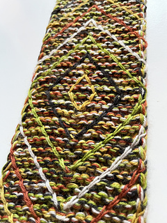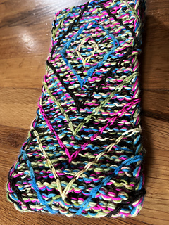 Designed with 5 strands of fingering weight yarn held together for a warm bulky fabric, the piece is marled garter stitch, with neat slipped stitch edges, and the diamond pattern running over the top is made by slipping and twisting single strands pulled apart from the working yarns.