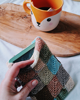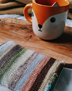 Patchy is a doubled layered cosy - for maximal protection for your Kindle - one side is made up of tiny mitered squares, the other is cosy stripes.