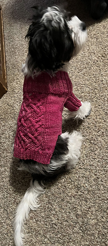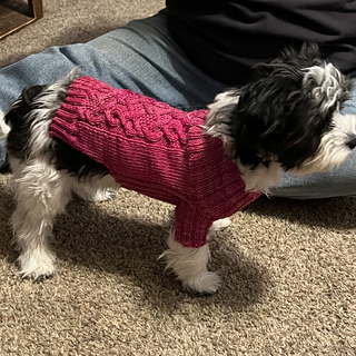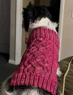 This is a pattern for a coat for a toy dog, that will keep him/her both warm and free from the snow and rain. The coat is comprised of a cabled back, and is knitted on two circular needles, in US size #4 and US size #3, and requires approximately 500 - 750 yards of yarn.