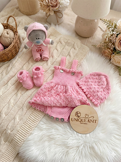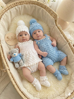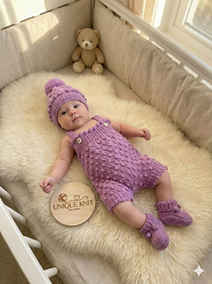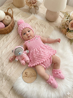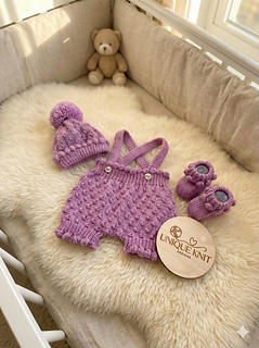 This pattern provides the instructions to make both sets, a dress set with matching beanie hat and booties and a short set with bobble hat and booties