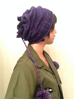 Worked in the round, brim up. The top is closed with a draw string attached to two pom poms.