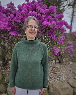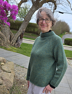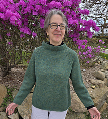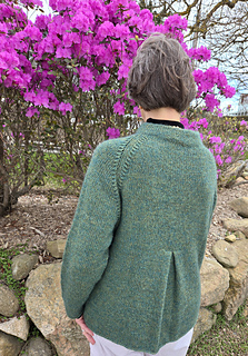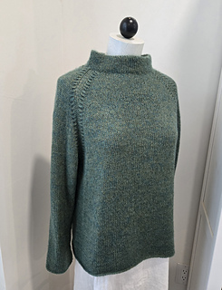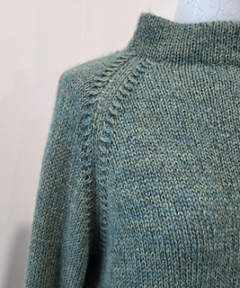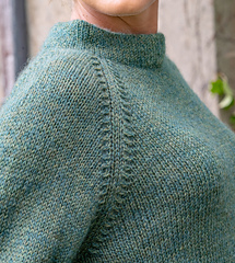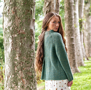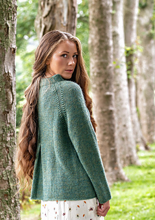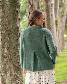 Pinehurst evokes a lovely romantic feel, with decorative decreases forming the raglan shaping, a funnel neckline and back box pleat. It’s knit in stockinette stitch with a strand of Berroco Lanas Light held together with Berroco Aerial creating a slightly marled fabric with halo. Pinehurst has no edging, if substituting yarns, wet block your swatch to ensure your sweater’s edges will not curl.