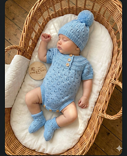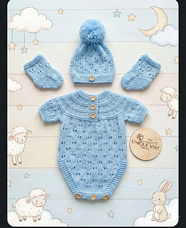 This sweet modern 3-piece Romper design features a textured yoke and an easy eyelet pattern which is then replicated on the hat and booties. The set is knitted from the top down using straight needles and knitted back and forth. meaning very little sewing is required and fewer seams.