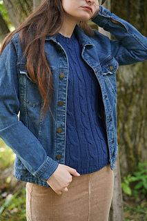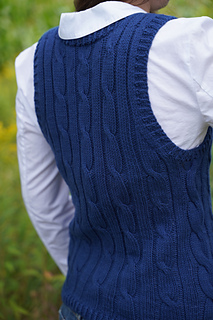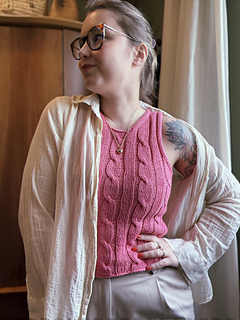 The final step of the yoke is to join the front and back. From here, the body is worked in the round in the cable pattern. Stitches are then picked up around the armholes and finished either with an I-cord edge or twisted ribbing. The hem can be finished with a simple bind-off in pattern or with twisted ribbing, depending on the version