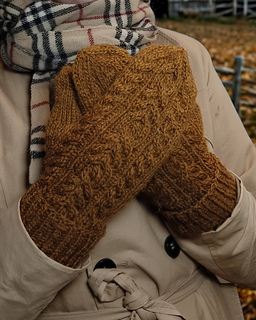 A beautiful cable panel runs along the back of the hand, while the palm is worked in plain stockinette. The ribbed cuff can be folded double if desired. The thumb is shaped using a thumb gusset for a comfortable fit.