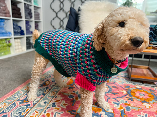 The sweater is worked top-down in the round with shaping through the chest, belly, and back for a more customizable, dog-friendly fit.