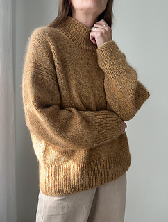 Mustard version - Isager Tweed (70% wool and 30% mohair, 50 g = 218 yds) in colorway Mustard, 4 (5) 5 (6) 6 (7) 7 (8) 8 skeins held together with Isager Spinni (100% wool, 100 g = 656 yds) in colorway Bale 59, 2 (2) 2 (2) 3 (3) 3 (3) 3 skeins held together with Isager Silk Mohair (75% kid mohair and 25% silk, 25 g = 231 yds) in color ward Caramel 63, 4 (5) 5 (6) 6 (6) 7 (7) 7 skeins