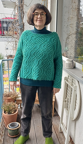 Notes: The pullover is worked in pieces and seamed. A circular needle is used to accommodate the large number of stitches. The back and front stitch counts assume 104 stitches between markers for cable. The sleeve stitch counts assume 54 stitches between markers for cable. During shaping, if there are not enough stitches to work a complete cable crossing, work the stitches of the partial cable as they appear. The side shaping is worked in the side ribbing on the back and front. The bell sleeve shapng is worked by decreasing in the rib. The collar is picked up and knitted in small cables with an interfacing part in stockinette stitch.