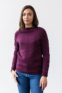 This wardrobe staple is a raglan worked from the top down. The hexagonal shoulder cable is worked out of the collar ribbing and transitions into the Primrose & Vines cable, which twists down the sleeves and sides, into the hem and cuff ribbing. With loads of stockinette in between cable columns, Primrose is a relaxing knit with striking style.
