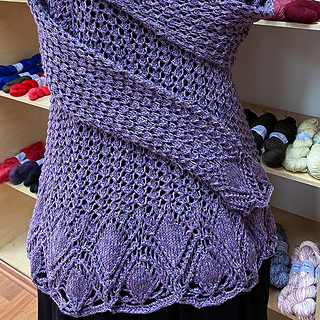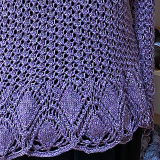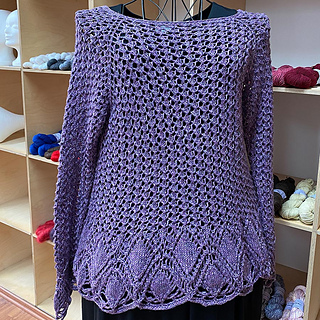 Nach dem Prinzip „Raglan von oben“ wird der Pulli bis zu den Abschlussspitzen im sich einfach zu merkenden Lochmuster in Runden gestrickt. Die blattförmige Abschlussspitze erhält ihre klare Struktur durch 2 Häkelrunden.