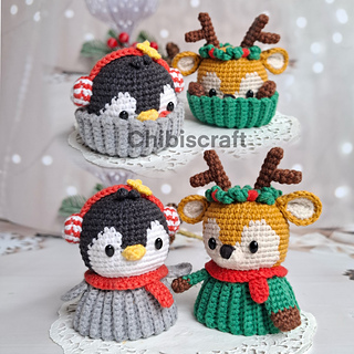 Approximate size: the finished amigurumi is about 9cm / 3.5” tall as a reindeer and 6cm / 2.4” tall as a cupcake.