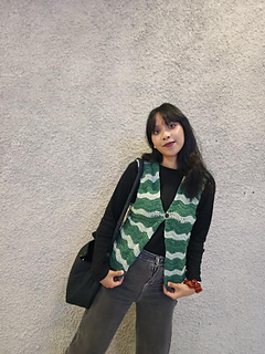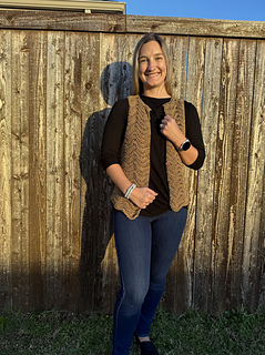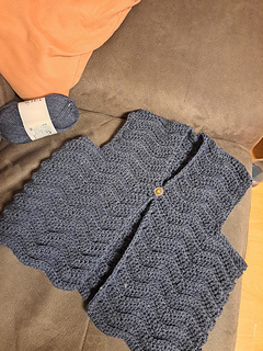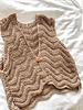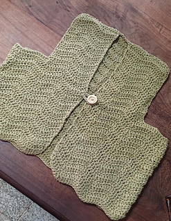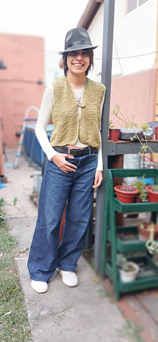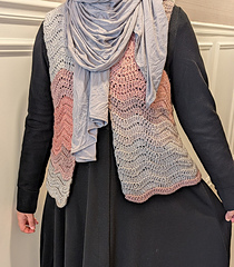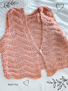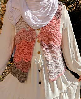 This vest is made using ripple stitch, and it is assembled in three flat panels. Vest is worked from bottom up, and the panels are sewn together to form the finished piece. Pattern includes sizing for 36”,40”,44”,48”,52” bust, and instructions on how to alter stitch counts for smaller/larger sizes. Vest is made using cotton, but you can surely substitute any similar weight yarn.