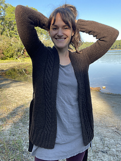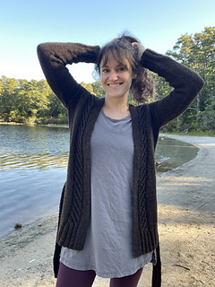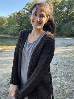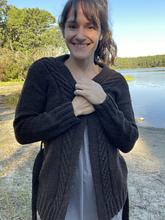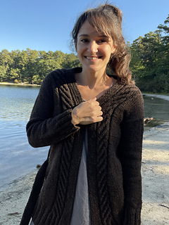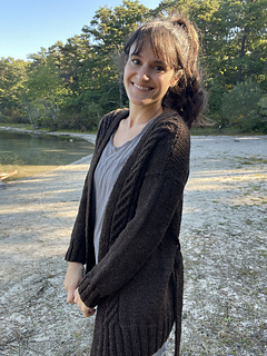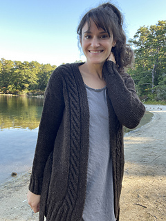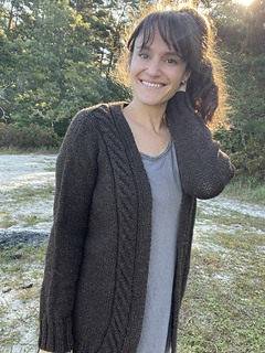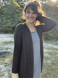 The Roe Cardi is a cozy, long cardigan with a waist tie. The garment features cables running up the fronts and center back, A line shaping in the body, a boxy drop shoulder shape, and gentle V-neckline shaping. The Roe Cardi is a great everyday layering sweater. Knit up in Fern Bridge Farm’s Royal Fern Worsted yarn a lovely worsted weight wool yarn available in several natural colors. The Roe Cardi is the perfect house sweater for fall and winter coziness!