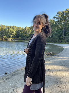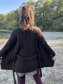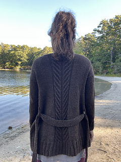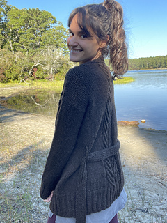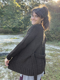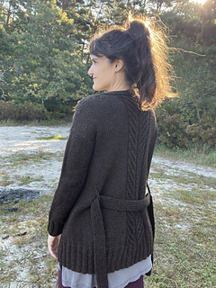 Construction: The Roe Cardi is knit from the bottom up flat. Decreases are worked in the body to create A-line shaping in the body; the fronts and back are knit separately and seamed at the shoulders. The neck strap is continued from the front shoulders, joined together in the back and seamed to the back center neck. Sleeves are picked up from the armholes and worked outward from the body in the round. Loops are knit for the belt and seamed to the sides of the sweater, and a ribbed belt is knit flat separately.