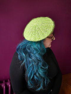 It features the same rosebud motif as its chunky relative, the same beret shape, and the same ability to turn into a beanie on a cold day.