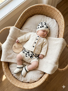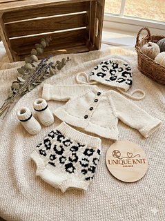 This pattern provides the instructions to make a 4 piece set, suitable for a 0-3 month old baby or a 16 - 22” Reborn doll, the size depends on the needles and yarn used. The details of which are in the pattern.