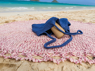 The Sand Dollar Beach Towel is a large circular towel made in variegated cotton yarn and a lace border for a boho aesthetic feel.