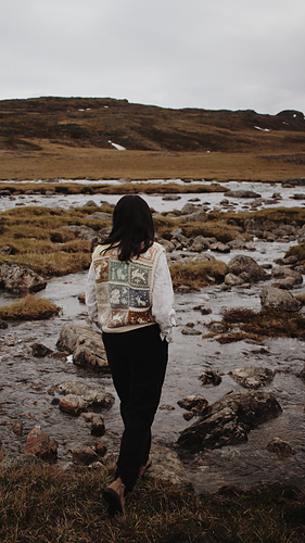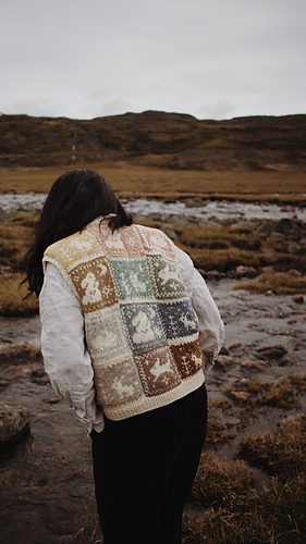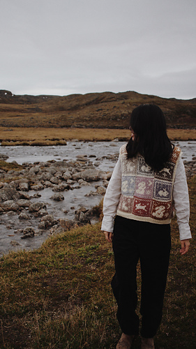 This vest is constructed from knitted squares seamed together to create its shape. Its modular construction allows for easy modifications to fit each body. The recommended positive ease is 5cm/2in to 20cm/7¾in.