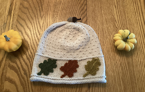 Knit in the round in a simple textured stitch, the bright oak leaves are knit separately and sewn on later. A cute acorn tops it off.