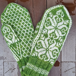 Siden det er valgt forskjellig garn og pinner til vottene, får de ulik størrelse selv om diagrammet er det samme. For å få målene som er oppgitt i oppskriften må strikkefastheten stemme. Ønsker du en mindre vott, kan du bruke tynnere pinner og/eller garn. Ønsker du en større vott, kan du velge tykkere pinner og/eller garn.