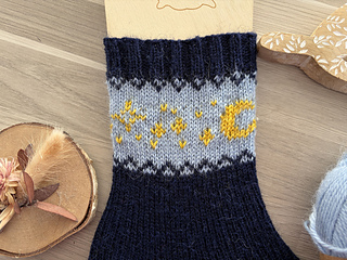 Les chaussettes Sélène se tricotent en toe-up. On commence par la pointe qui est tricotée classiquement en augmentant de chaque côté et on termine par la cheville qui est tricotée en côtes. La cheville est ornée d’un motif représentant la lune et des étoiles tricoté en jacquard.