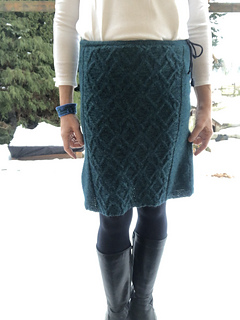 Seneka, a nickname for Senna meaning brightness in Arabic. This is an A-line skirt with an elaborate cabled center. The skirt ends in a waistband; knitted like a hem in one piece with boot laces placed inside. Seneka is knitted in the divine Neighborhood Fiber Co. Organic Studio Worsted and can be worn as a skirt or a poncho or a maxi hood – all together with the matching Senna cardigan.