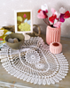 Oval doily with a single motif in center and two smaller round motifs on each side, lace border.